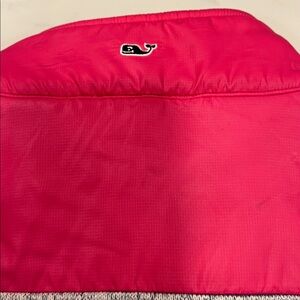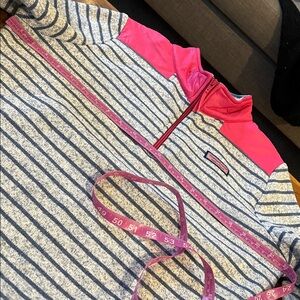 Chic pullover with blue stripes-sort of sweater knit with structure. Features bright pink shoulders and zipper.