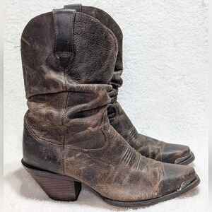 Durango boots with a vintage leather finish. Slouch style shaft, almond squared toe with decorate toe cap. Small white spot on one boot, otherwise good condition overall. Women's US Shoe size 7.5