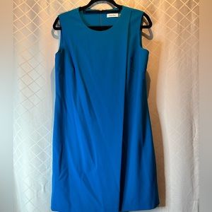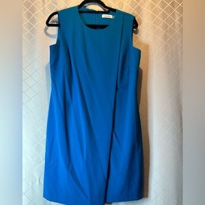 Gorgeous Calvin Klein Sleeveless Blue Sheath Dress with faux crossover detail. Size 10. Great pre-owned condition. Fully lined.