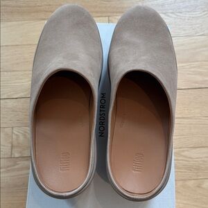 Step into style with these chic suede heeled mules. Perfect for any occasion, these tan shoes offer both comfort and elegance. Worn only twice, minimal signs of wear. Tiny scuff on upper right side of shoe, as noted in photo.