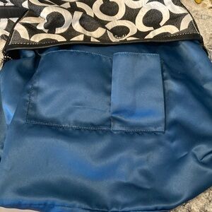 This fun and functional bag is in very good condition. It is freshly cleaned and I conditioned the leather. Colors are black and white or could be very light gray. The pattern consists of large letter Cs and the word Coach spread throughout the pattern.