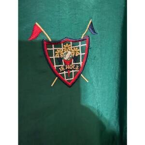 Catalina Collection green windbreaker jacket. It is size medium and has a half zip closure. It has a hood and two front pockets. The jacket is made of 100% nylon and is machine washable. #golf #jacket #windbreaker #hood #green