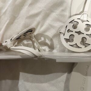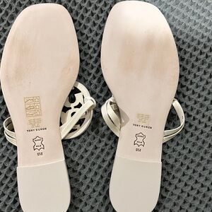 Chic Tory Burch square toe sandals with signature logo design. Ideal for casual elegance. Cream/Bone in color. Wore these once minor scuff on bottom. Like brand new.
