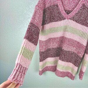 This Torrid pullover sweater in size 1X features slouchy long sleeves and a relaxed V-neck design, knit in cozy multicolored pink stripes. The tunic length and chunky ribbed texture offer softness and warmth with a comfortable, oversized fit. Perfect for layering in cooler months. 76% acrylic, 22% nylon, 2% spandex.