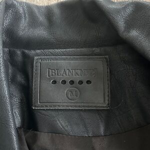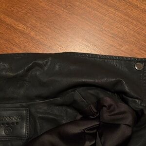Chic black leather moto jacket. Features asymmetrical zipper and zippered pockets. Adds edge to any look.