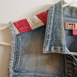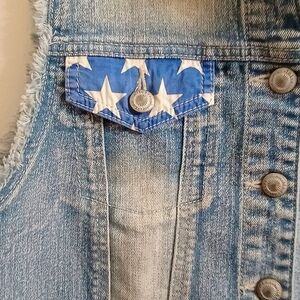 Stylish denim vest featuring blue stars and red stripes. Perfect for a casual look.