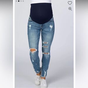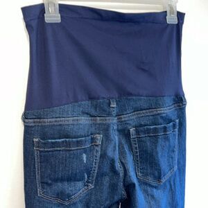 A pair of dark blue wash maternity jeans featuring distressed detailing, five pockets and an elastic belly band.
