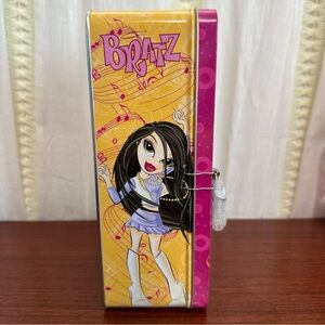 The product is a brand new vintage Bratz tin locker in pink and yellow colors, featuring a lock and key. The set includes a bank, key, and lock made of tin and metal materials. This item belongs to the Bratz franchise, catering to fans of the popular doll series. Perfect for storing and protecting Bratz dolls or other small treasures, this locker adds a nostalgic touch to any collection with its retro design and vibrant colors