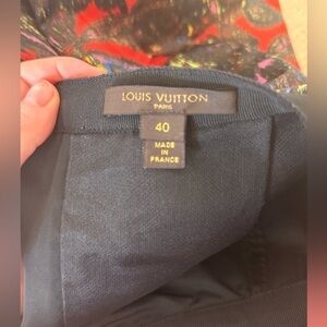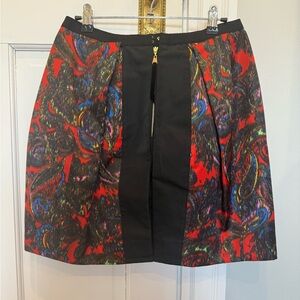Red silk bubble skirt with multicolor print, architectural pleats at the front, and black panel at the back. LV logo is hidden in the print of the fabric and on the zipper pull.