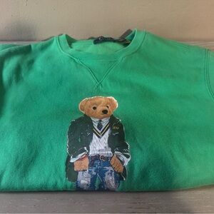 Vibrant green crewneck sweater. Features iconic bear graphic. Comfortable and stylish.