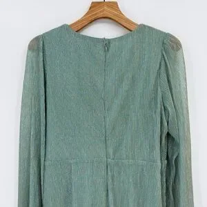 Discover an exclusive dress that's perfect for any occasion! Crafted from a shimmering blue-green material with slight stretch, this stylish garment features a flattering V-neckline and elegant pleats throughout.