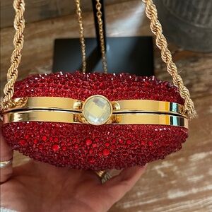 Sparkle with this red heart-shaped glitter clutch. Features a gold chain strap. Extra gold chain for a longer look included