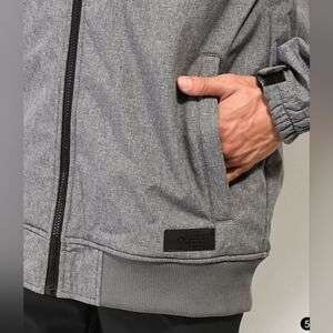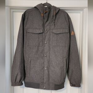 Sleek gray jacket with hood. Ideal for layering. Casual and stylish.