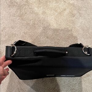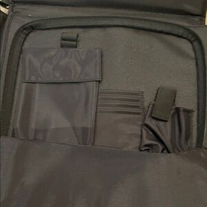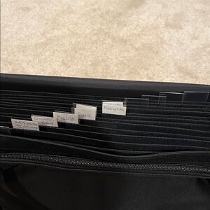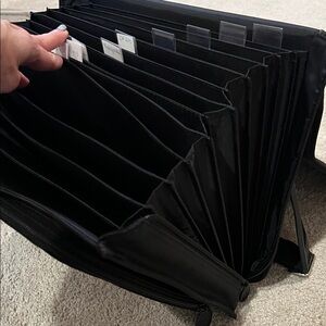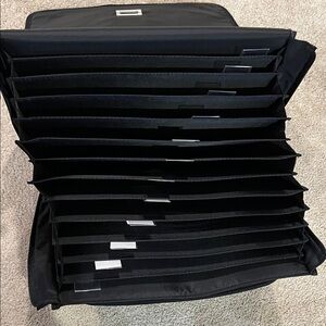 Black tote with adjustable strap. Can use for invoices, papers, photos…has 13 individual slots and is expandable. Has front zip pocket with room for misc Great organization tool! Features secure closure and comfortable handle. Barely used. Will take offers