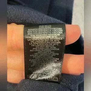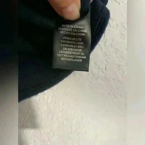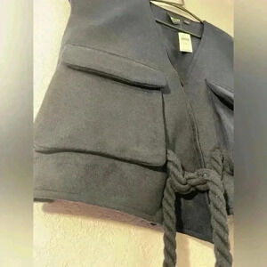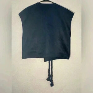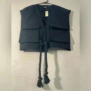 The navy blue vest has a V-neck and two large front pockets. It also features a braided tie with tassels hanging from the bottom.