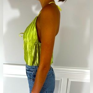 Vibrant lime green crop top. Halter neck with tie front. Perfect for summer outings.