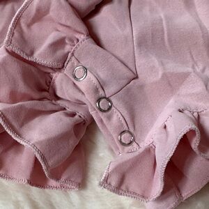 Charming 2T dusty rose romper with ruffled hem and button details. Perfect for any occasion. Tie straps. New without tags.