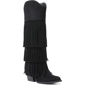 Women's Black Retro Pointed Toe Knee High Pull On Block Chunky Heel Fringe Boots