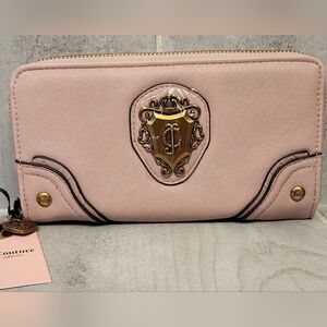 Exclusive edition Juicy Couture wallet in pink. Perfect for organizing your essentials. Featuring the iconic brand emblem, it's a must-have accessory for any fashion-forward individual. Gold heart zipper pull.