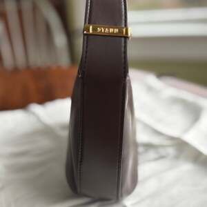 STAUD Demy Leather Shoulder Bag in Espresso Brown. This chic, minimalist handbag features premium smooth leather (100% lamb leather) in a rich chocolate brown hue. Designed with a curved silhouette and a comfortable shoulder strap, it is the perfect everyday for a sophisticated look. Features a spacious interior for essentials and high-quality gold-tone hardware.