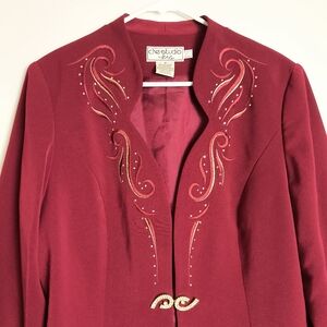 Elegant red blazer with intricate embellishments, perfect for adding a touch of sophistication to any outfit.