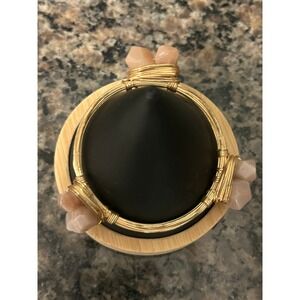 Keywords: bangle bracelet, wire wrapped, crystal jewelry, gemstone bracelet, peach gemstone, pink gemstone, bohemian jewelry, artisanal, handmade style, unique bracelet, gold tone, statement bracelet, fashion jewelry