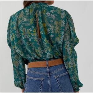 Free People Sea Combo Clarissa Floral Print High Neck Smocked Blouse. Smocked waist and cuffs. Adjustable Tie Open Back Slit. Slightly Sheer Sleeves. Swiss Dot Details.