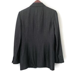 Timeless and chic Donna Karan Essentials blazer in a deep black/charcoal/gray tone. Beautifully tailored with a classic collar, button front, and sleek front pockets. The wool-rayon blend gives it a soft yet structured feel — perfect for work, dinner, or dressing up denim.