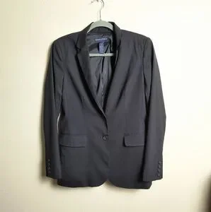 This sleek Banana Republic blazer in black offers a modern cut with a smooth wool-blend fabric, perfect for professional settings. Its tailored fit ensures a sharp and polished appearance, making it an essential addition to any wardrobe.