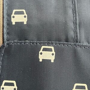 Stylish wallet featuring a car print design. Red accents add a pop of color.
