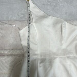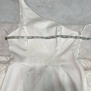 Details: One-shoulder belted midi dress with side zip closure, partial lining, and a flattering side slit. Shoulder-to-hem ≈ 45" (see photos). Clean white fabric with structured seams for a tailored silhouette — ideal for showers, rehearsal dinners, or any dressy occasion. Smoke-free, pet-free home. Measurements available in photos — happy to take additional measurements on request. Offers & bundles welcome!