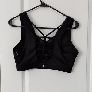 Sleek black sports bra with crisscross back. Ideal for active wear.