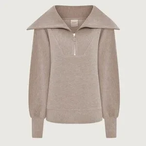 Varley Vine Half-Zip Pullover in Taupe Marl, size Small. Oversized fit with high collar, exaggerated sleeves, and signature Ottoman rib texture. Soft cotton-blend fabric for elevated comfort. Front length 25", sleeve 26". Very good condition. Perfect over leggings or sweats for chic athleisure style. Same or next day shipping.