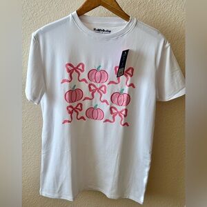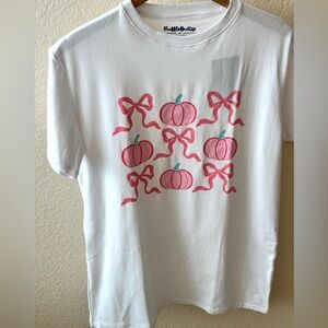 Charming Ruffle Butts tee with pink pumpkins and bows. Soft and stylish for any occasion.
