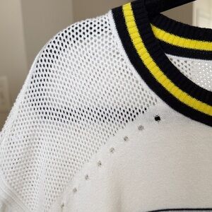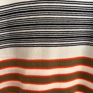 Chic sweater with black, orange, and yellow stripes. Perfect for any occasion.