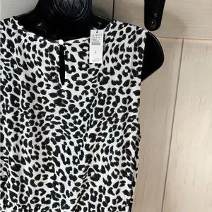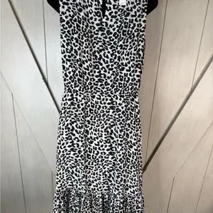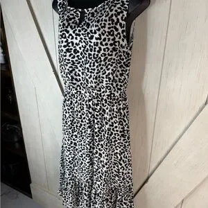 Elegant midi dress with a striking animal print. Sleeveless design with a flowing skirt. Ideal for versatile styling.
