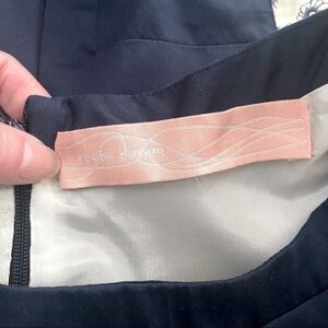 Beautiful one of a kind sample dress by Saudi designer Rouba Dayani. Plain navy with patterned panels down the sides. Cap sleeves. Pencil skirt. Slight shoulder pads for structure.