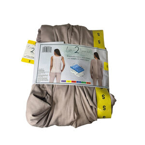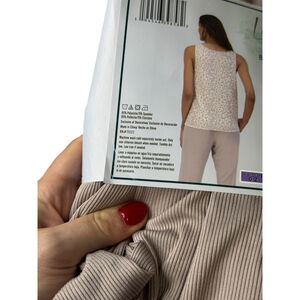 This new Live 2 Lounge 3-piece lounge set, size Small, includes a light beige/pink ribbed open-front cardigan, matching ribbed full-length pants, and a sleeveless tank top with a subtle light animal print. Constructed from 95% Polyester and 5% Spandex, the set features cooling technology for moisture wicking and maximized airflow. The cardigan has long sleeves, and the pants appear to be a straight-leg style. The item is new with tags, showing no visible imperfections or signs of wear. Comes from a smoke free home!