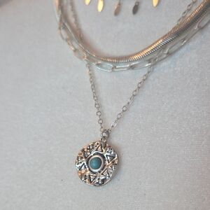 Chic silver necklace with multiple layers. Features a striking blue accent. Ideal for any occasion.