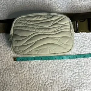 Quilted belt bag with adjustable strap. Secure zipper closure. Sleek and functional design.