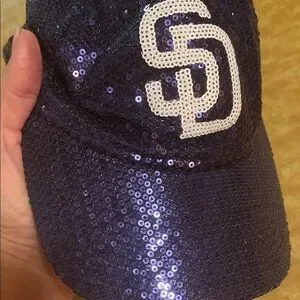 Stylish New Era hat with shimmering blue sequins. Features bold white Padres logo. Perfect for adding sparkle to any baseball event. Stand out with this sparkling sports fan. In very good preowned condition from a smoke free home, freshly washed and air dried.