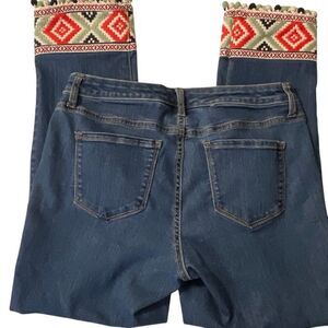 The item shown in the image is a pair of Crown & Ivy jeans featuring a decorative embroidered and embellished cuff at the hem. The cuff has a geometric pattern in a multicolor design, and the jeans are a medium wash, straight-leg style. The cuffs also include small tassels or pom-poms. These jeans are a specific style from the brand Crown & Ivy