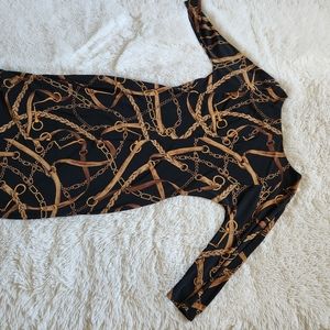 Elegant long sleeve dress with chain print. Features black and gold colors. Perfect for stylish occasions.