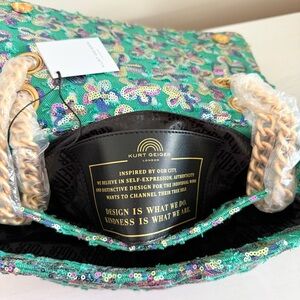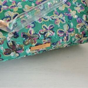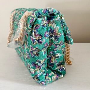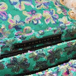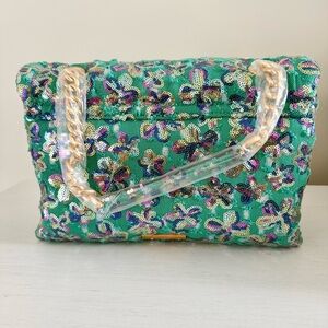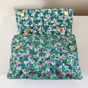 Gorgeous green bag adorned with floral sequin embellishments and gold tone hardware