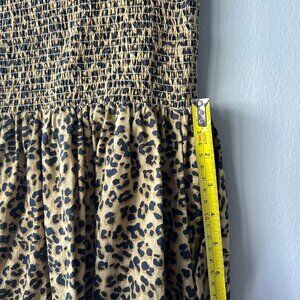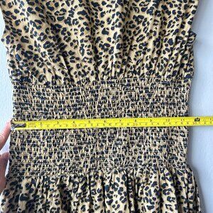 • Details: Leopard print throughout, front zip neckline, smocked elastic waist, cap sleeves, relaxed fit through skirt
