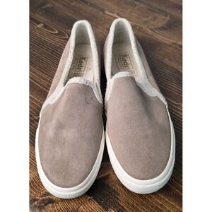 The product is a pair of Keds comfort shoes in size 8, featuring a tan suede upper with faux fur lining. These slip-on shoes have a classic sneaker style with a low top design, cushioned insole, and a solid beige color. The outsole is made of suede, and they are designed for athletic use with a comfortable fit. Perfect for women looking for a stylish and cozy shoe option.