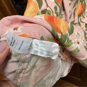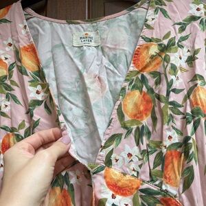 Marine Layer Camila mini dress in orange print with pink background. Features a hook and eye closure at the bust for coverage options. Tie back. 100% lyocell.