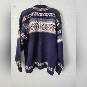 Stay cozy and stylish with this navy cardigan featuring intricate Nordic patterns. Perfect for casual outings and gatherings.