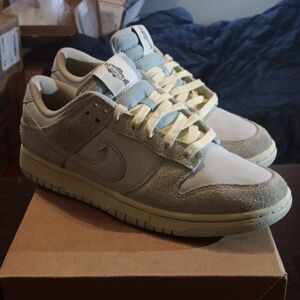 Elevate your look with Nike Dunk Low SE Gone Fishing Chinook Salmon sneakers. Stylish gray and cream design. Ideal for casual wear. Men's 9.5 Women's 11