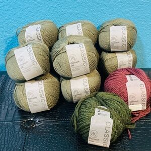 Bundle of Classic yarn in green and red. Perfect for knitting and crochet projects.